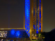 The installation consists of approximately 4,000 vertical light elements, arranged within a 43-meter-diameter circular field. Varying in height, the light poles form a shifting topography that recalls the undulating surface of sand dunes. Rather than depicting the desert literally, Light Dunes abstracts its behavior: an ever-changing landscape shaped by external forces and internal relationships.